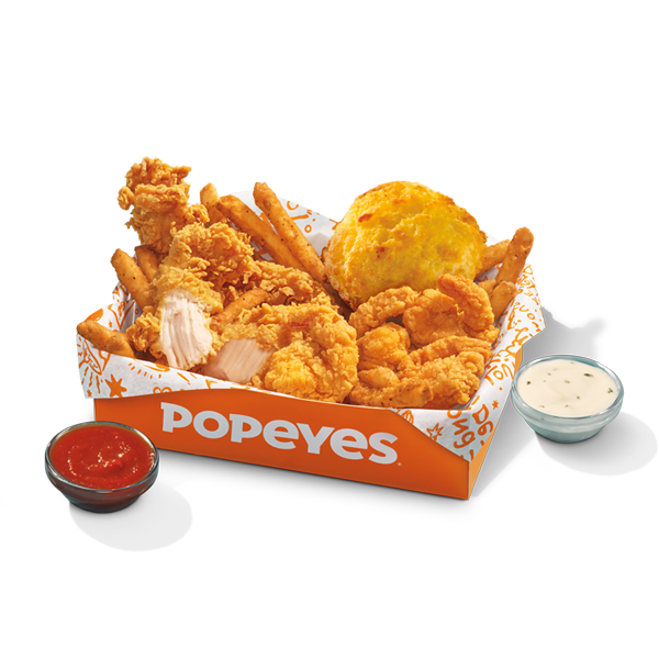 4 Louisiana Style Shrimp sazonados a tu gusto con salsa Creole Cocktail para dipear, dos jugosos tenders, un complemento, una bebida, un biscuit y una salsa adicional para dipear. Puedes seleccionar la salsa para dipear de tu preferencia, según la disponibilidad por restaurante.