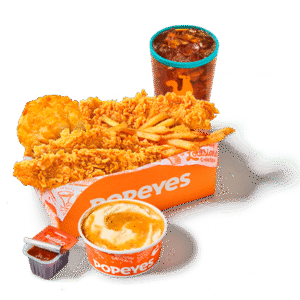 Elige tu Caja Cajún con 2 presas o 3 tenders con 2 complementos regulares, 1 honey biscuit y refresco.